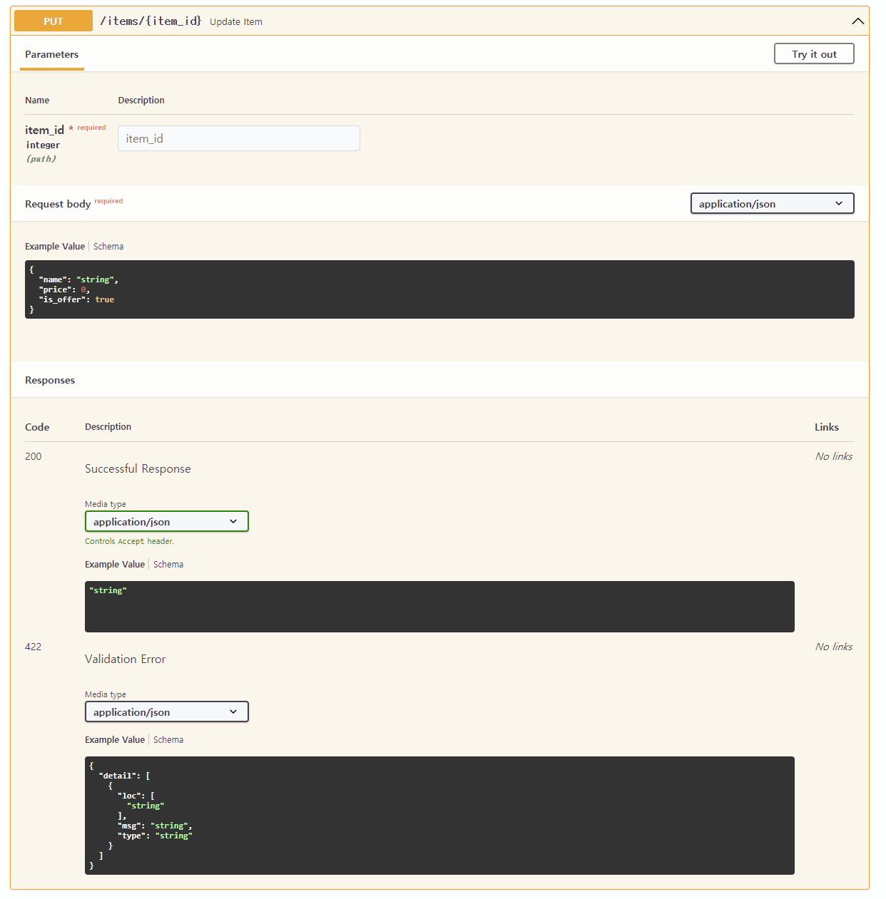 Method와 성공여부, 타입, 예시 값(타입)을 알려준다. 또한 PUT 요청과 같은 Body를 받을 수 있는 요청은 다릅니다.