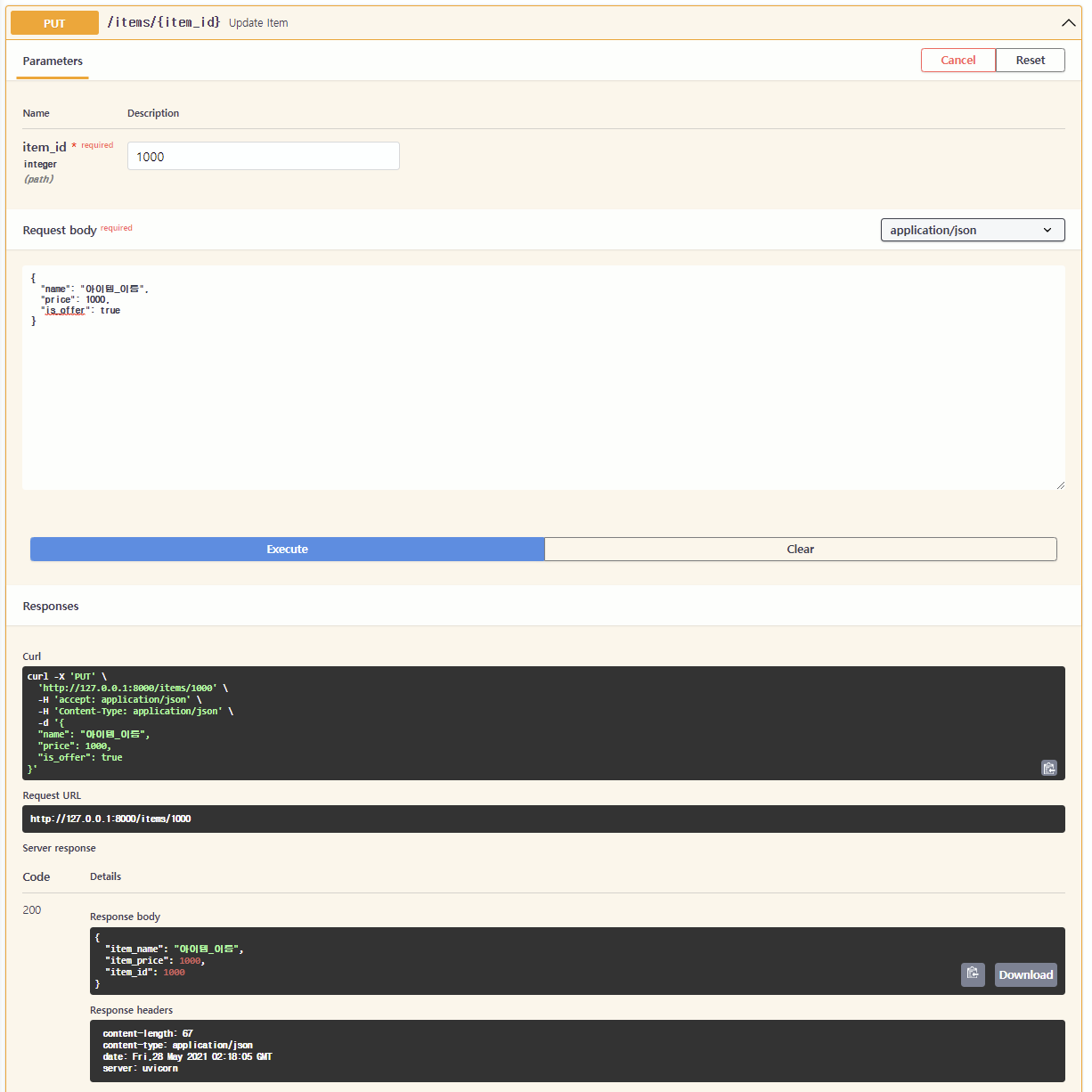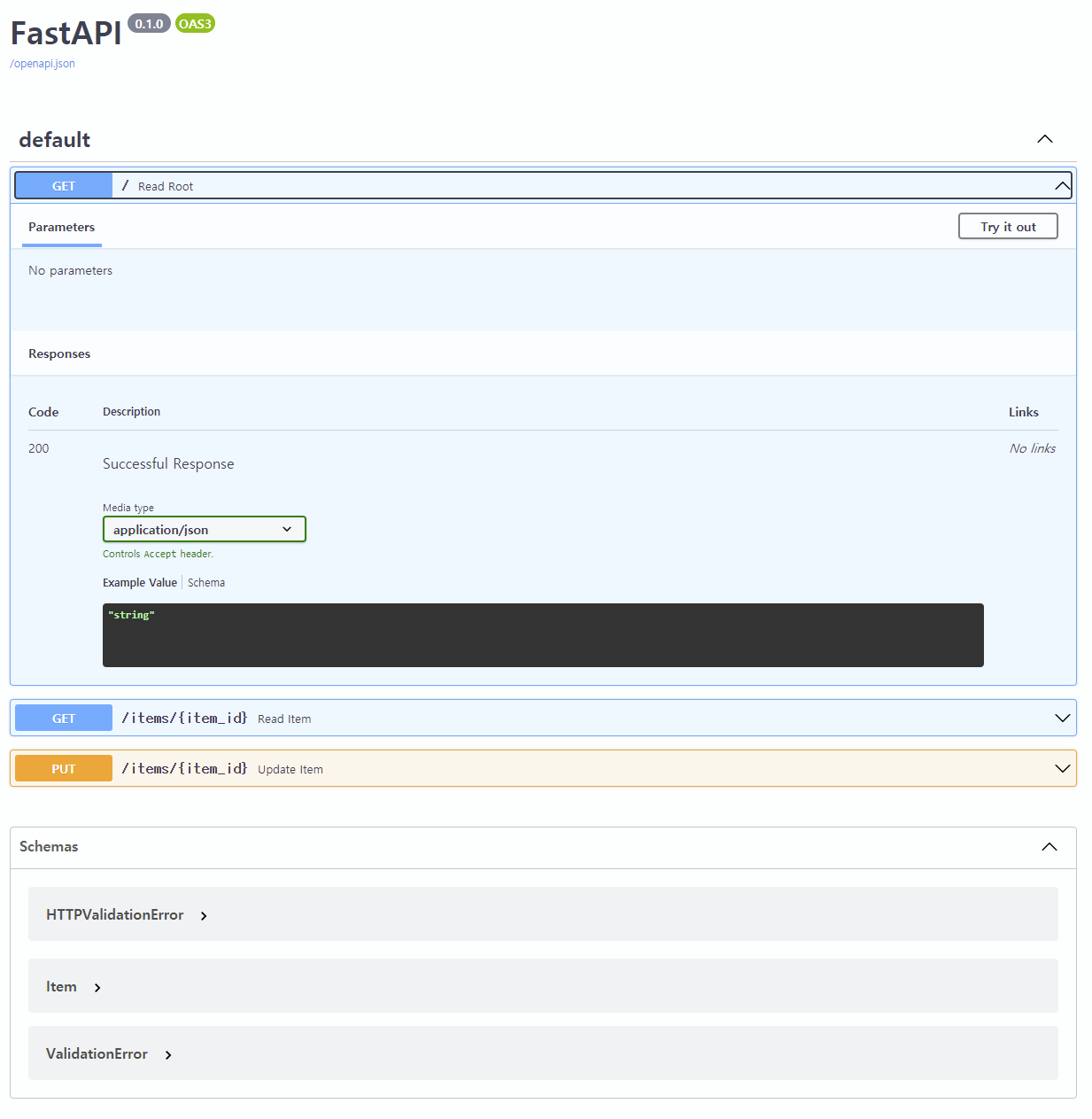 # main.py from typing import Optional from fastapi import FastAPI from pydantic import BaseModel app = FastAPI() class Item(BaseModel): name: str price: float is_offer: Optional[bool] = None @app.get("/") def read_root(): return {"Hello": "World"} @app.get("/items/{item_id}") def read_item(item_id: int, q: Optional[str] = None): return {"item_id": item_id, "q": q} @app.put("/items/{item_id}") def update_item(item_id: int, item: Item): return {"item_name": item.name, "item_price": item.price, "item_id": item_id}실행